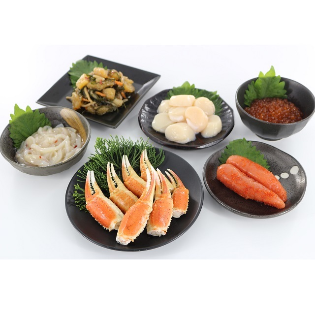 【雅】内容量:辛子明太子250g、生冷ほたて貝柱200g、かずの子松前漬200g、ズワイカニ爪200g、いくら醤油漬け150g、いか塩辛150g