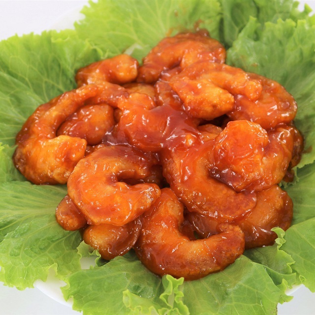 プリプリのえびにチリソースを絡めました。海老屋が作ったえびチリ。