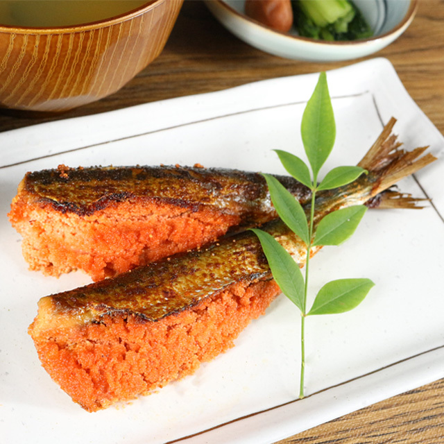 道東で漁獲され、釧路港で水揚げされた脂の乗った真いわしを使用。腹にたっぷりと明太子を詰めた人気商品です。